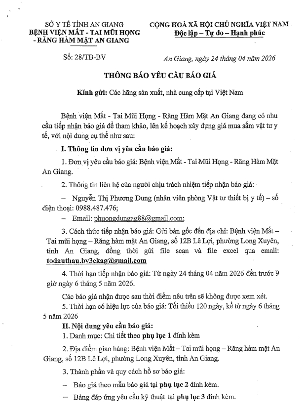 Thông báo yêu cầu báo giá, kính gửi các hãng sản xuất, nhà cung cấp tại Việt Nam, Bệnh viện Mắt - Tai Mũi Họng - Răng Hàm Mặt An Giang đang có nhu cầu tiếp nhận báo giá để tham khảo, lên kế hoạch xây dựng giá mua sắm vật tư y tế